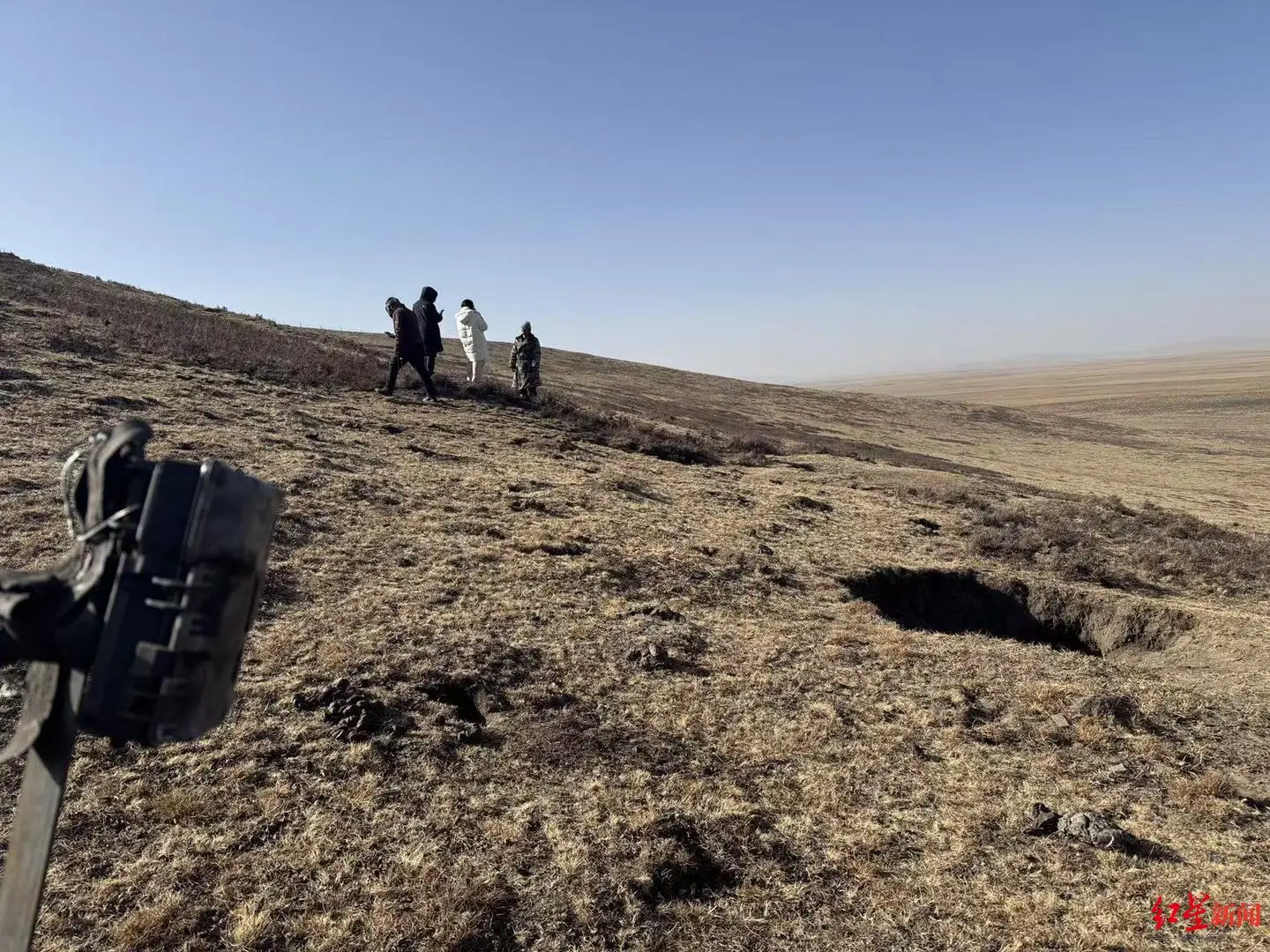 ▲王青多吉带记者检察狼窝,狼窝近邻还装有红皮毛机