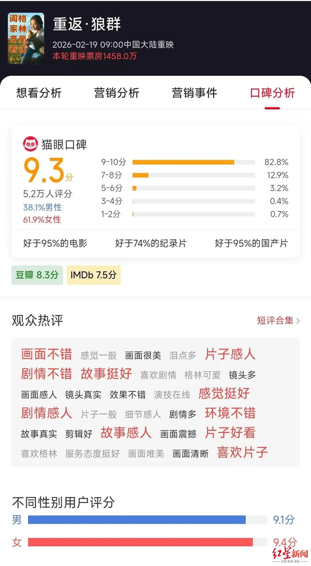 记载片《重返·狼群》2月19日(大年头三)院线重映,好多不雅众为之感动。