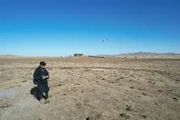 ▲扎西放飞无东谈主机准备驱赶狼群
