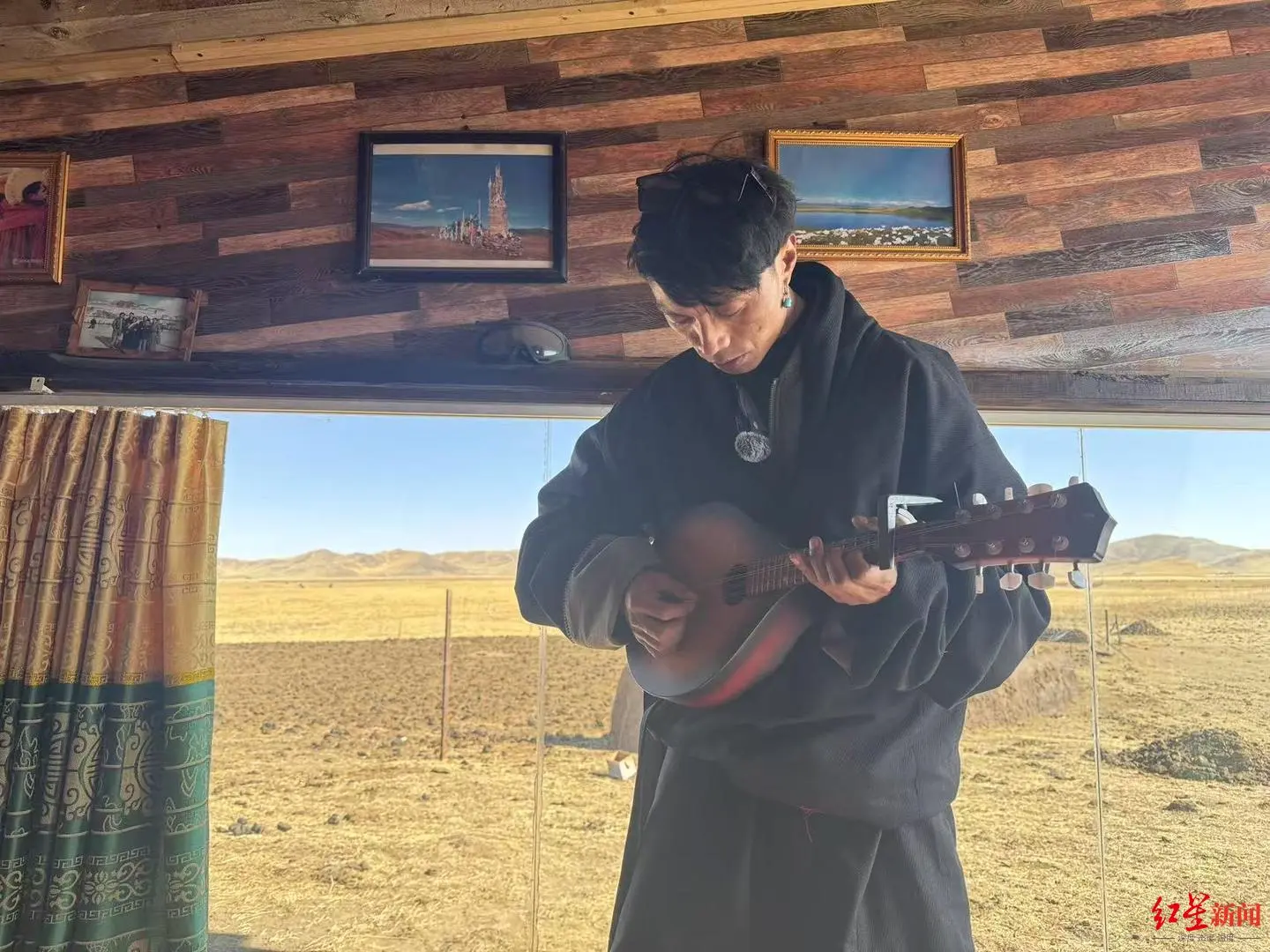 ▲在牧场上,扎西最近刚买了一把曼陀林熏陶弹奏